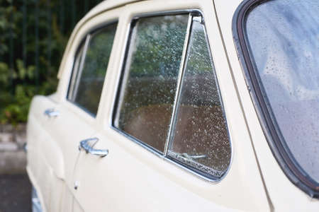 old car close-up, raindrops on the windshield, colored side, night, evening