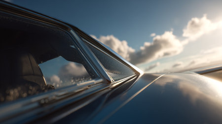 A sleek car door with a reflective surface showing a cloudy sky