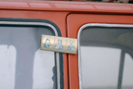 Russia, Saint-Petersburg, July 2019:Safety of a vehicle with a mounted icon of Holy people.