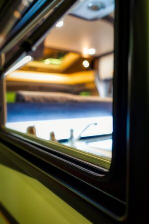 BERN, SWITZERLAND – OCTOBER 26, 2019: Look into a new camper van with modern interior on swiss caravan salon