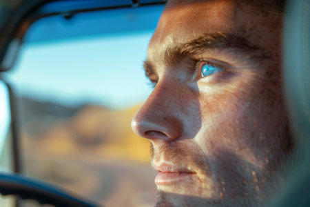 A man with blue eyes is driving a car. The sun is shining brightly, and the man is looking out the window