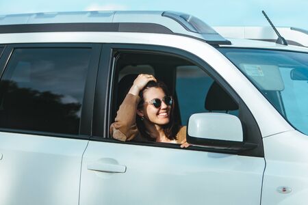 Pretty, young woman driving a car -Invitation to travel. Car rental or vacation.