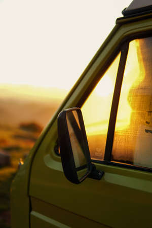 Golden hour green wolksvagen camper detail.