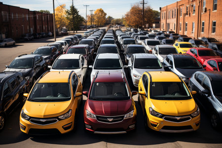Aerial view of colorful cars parked in city parking lot, urban transportation scene