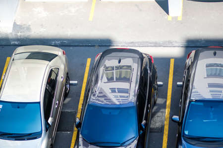 Top view of car parking area on asphalt road in modern condominium building