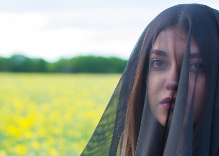 Woman's eyes in veil, intense gaze, textured fabric, tight shot, emotional depth