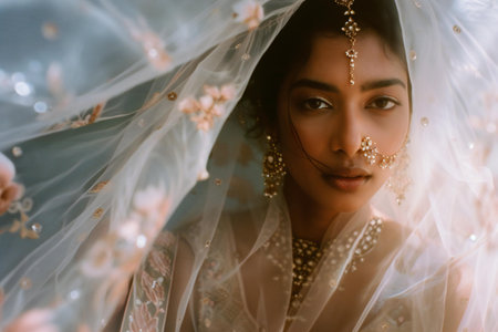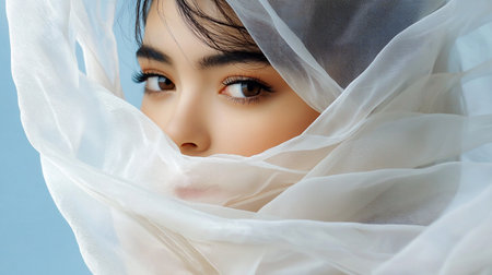 Close-up of a woman's face, her captivating brown eyes peering through a delicate, sheer white fabric. Soft, diffused light enhances the ethereal mood, creating a sense of mystery and beauty.