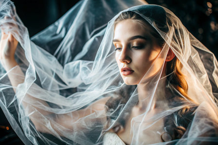 A captivating portrait of a woman draped in a mesh veil, illuminated by dramatic lighting, creating an ethereal and serene atmosphere against a dark backdrop.