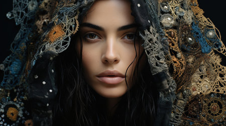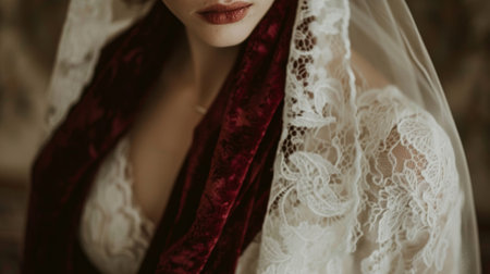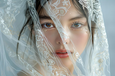 A creative close-up of a woman's face partially covered with a delicate lace scarf, highlighting her striking eyes and the texture of the fabric for a mysterious allure.