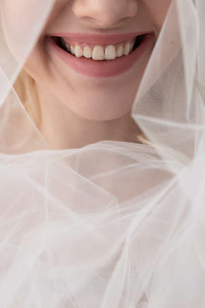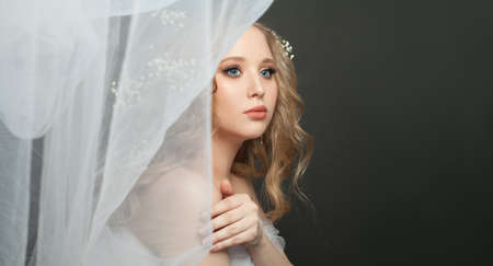 Close-up portrait of a beautiful girl wearing a veil. Beautiful tender bride woman. Fashion shot.
