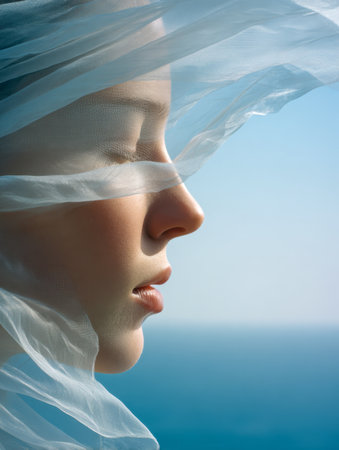 A tranquil woman draped in diaphanous cloth gazes peacefully into the distance, embracing the soothing sea breeze under clear skies and gentle sunlight.