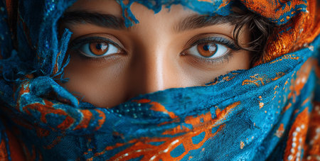 A woman with striking brown eyes peers from beneath a colorful scarf, which features intricate patterns in blue and orange. The look evokes a sense of mystery and cultural beauty.