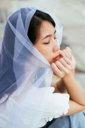 Close up - Portrait of young asian long dark hair woman bride with white veil sit outdoors on the beach.