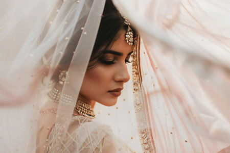 Beautiful eastern style bride with white veil and hairpiece posing outdoors at sunset. View from the back.