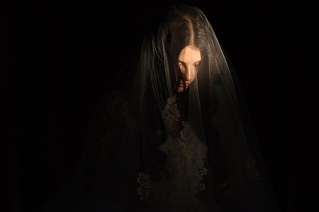 Beautiful mixed race woman seal inside the bride viel. Wife ghost. Isolation over black background.