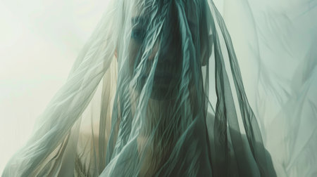 Ethereal man Shrouded in Delicate Veils in a Dreamy Setting