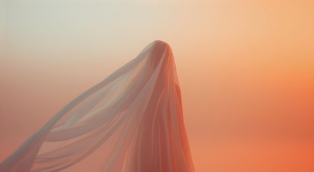 Translucent fabric flows in graceful curves against a gradient sky with sunset light rays.