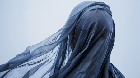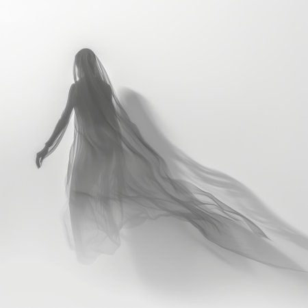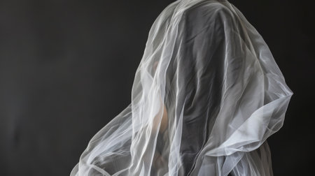 This captivating image features an ethereal figure in flowing fabric, shrouded in soft shadows and creating an air of mystery and grace in a monochrome setting.