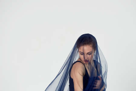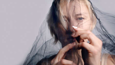 Fashion Model with a black net veil. Isolated woman under black cloth Net. Portrait of a blonde girl with serious facial expression trying to use hands gesture. High-quality studio shot.