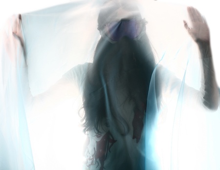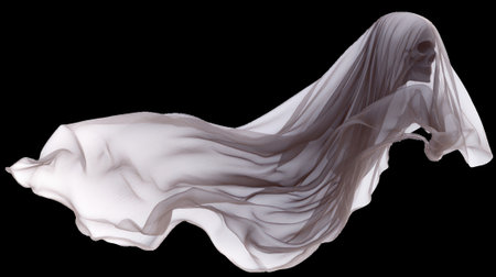 Ghostly skull hiding under waving transparent veil on white background