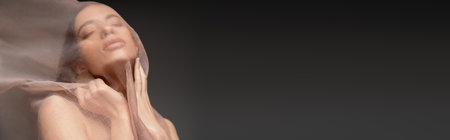 Asian model with closed eyes posing under beige cloth while standing isolated on black, banner