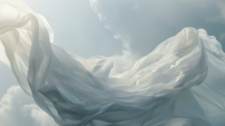 Flowing fabric against cloudy sky creating a dreamlike atmosphere.