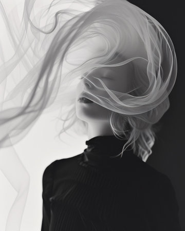A woman is captured in a moment of serenity with her hair gracefully billowing around her face, presented in a striking black and white composition that accentuates the fluidity of movement and contrasts in texture.