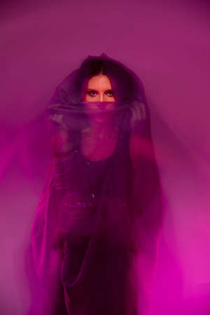 Beautiful woman covered in headscarf turning into purple background, shoot with both continuous and instant flash light made with professional makeup artist and hairdresser