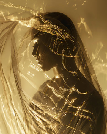 A monochromatic image showcasing the profile of an ethereal woman with her hair pulled back, enveloped in flowing, semi-transparent fabric.
