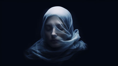 A woman is depicted wearing a white veil against a stark black background. The focus is on the contrast between the white veil and the dark surroundings.