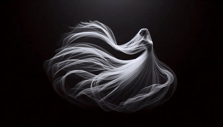 Ethereal ghostly form flowing white textile against dramatic abstract background colored smoke dynamic vibrant fantasy conceptual shot.