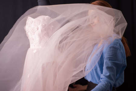 Close-up of a girl showing veil a narrow, wide braid and lace figure. The concept of choosing wedding accessories for the bride.