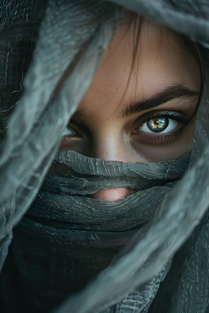 Woman's eyes in veil, intense gaze, textured fabric, tight shot, emotional depth