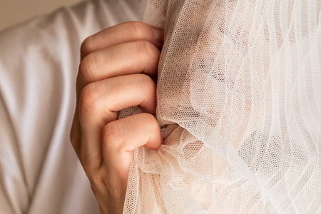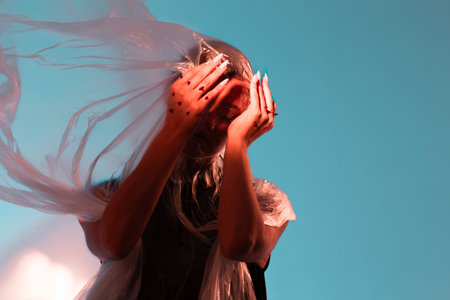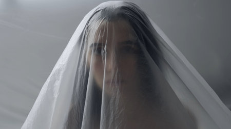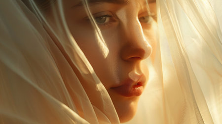 A woman's face Partially Hidden Behind a Sheer Fabric, adds a soft, ethereal quality in a room filled with morning light .