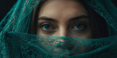 AI Generated. Close-up of a woman's eyes peering out from behind a teal veil, conveying mystery and depth