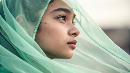 In this artistic shot a young individuals face is partly veiled by a semitransparent neon mint cloth. The soft delicacy of the fabric merges harmoniously with their facial features.