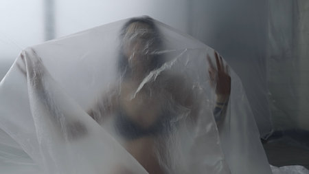 Human trafficking. Defocused art portrait. Forced labour. Slavery freedom. Profile of powerless woman hostage covered with wrinkled plastic polyethylene film isolated on gray background out of focus.