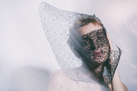 A young woman gazes through a mesh veil in a stylish studio, banner