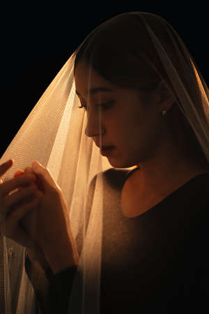 Beautiful mixed race woman seal inside the bride viel. Wife ghost. Isolation over black background.