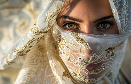 Close-up of a woman with striking eyes wearing an ornate white veil, illuminated by natural sunlight