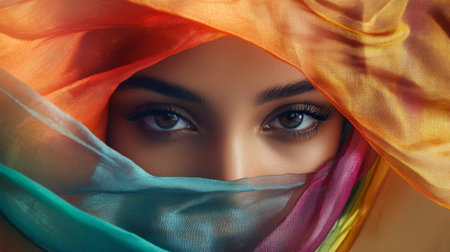 This stunning image captures the expressive eyes of a woman, beautifully framed by flowing silks. The vibrant colors and soft textures evoke a sense of mystery and cultural richness.