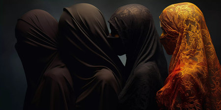 Four women in ornate dresses and veils sit together, rich cultural fashion. Traditional attire with lace and vibrant colors. Muslin wives.
