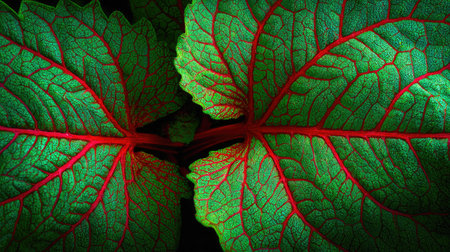 Close-Up of Vibrant Green Leaves with Red Veins Botanical Texture