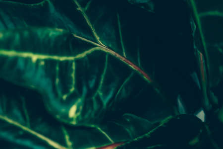 close up line art pattern of dark green tropical foliage, nature background, blurred photo.