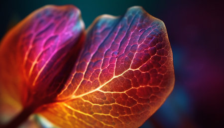 Vibrant leaf vein pattern on black background showcases natural beauty generated by artificial intelligence