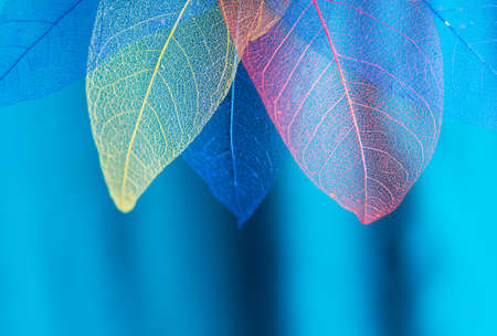 Colorful transparent and delicate skeleton leaves over wooden white background