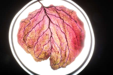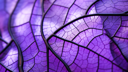 Close-up image of a leaf revealing the detailed vein structure and purple hue