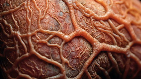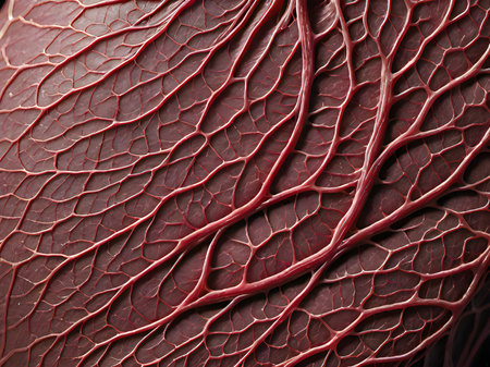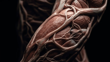 red muscle fibers of arm on background of microblood vessels, created with generative ai