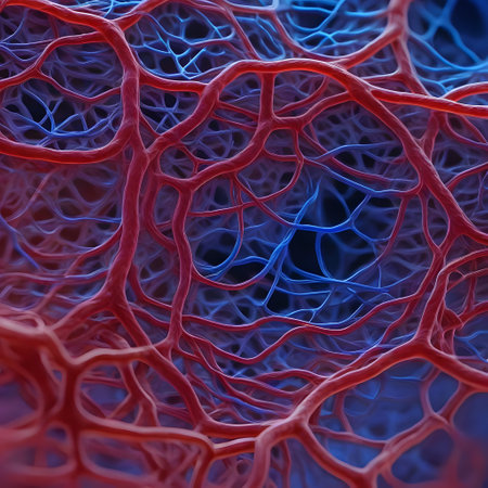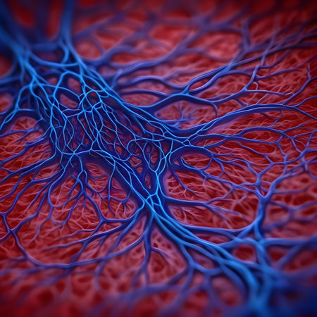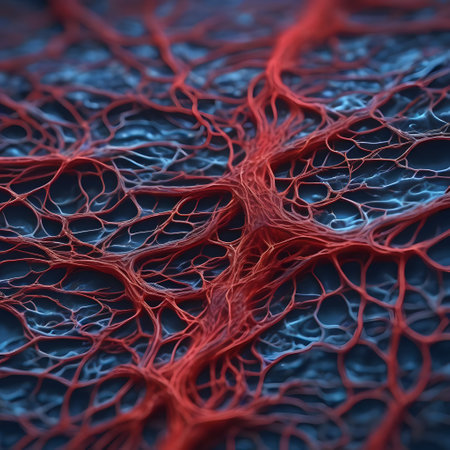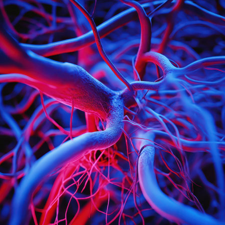 Vessel flow texture in red and blue lighting showing microscopic circulation system pattern symbolizing human biology, anatomy, and healthcare science visualization.