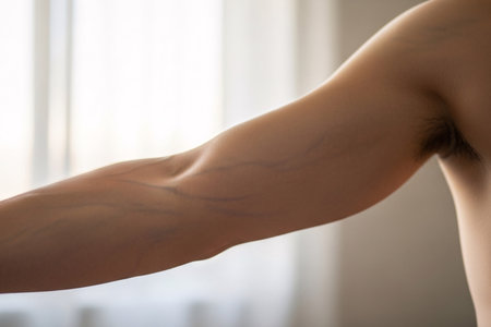 Close-up view of blood flow through a human arm, showcasing veins and vessels for medical use or studies related to intravenous circulation and health.